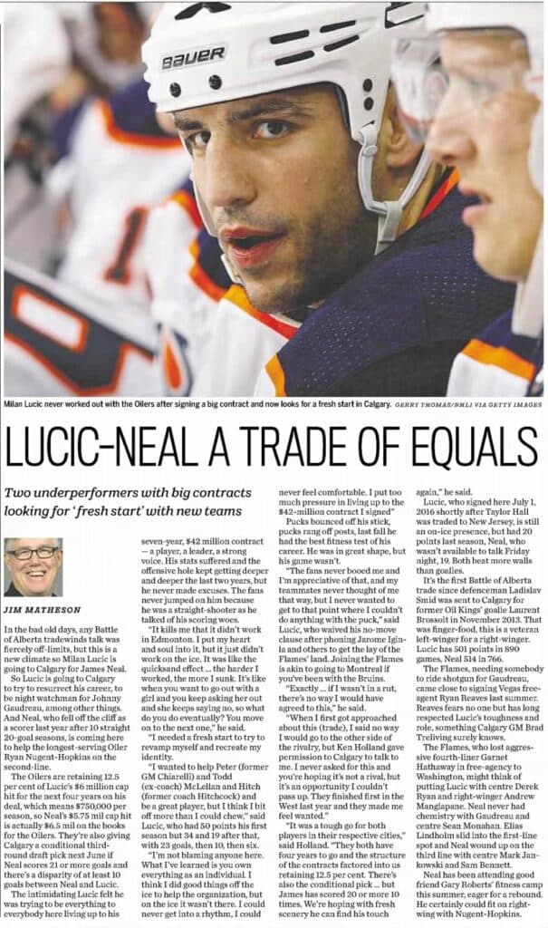 An Edmonton Journal article from July 20, 2019 details the trade the Edmonton Oilers made sending Milan Lucic to the Calgary Flames for James Neal.