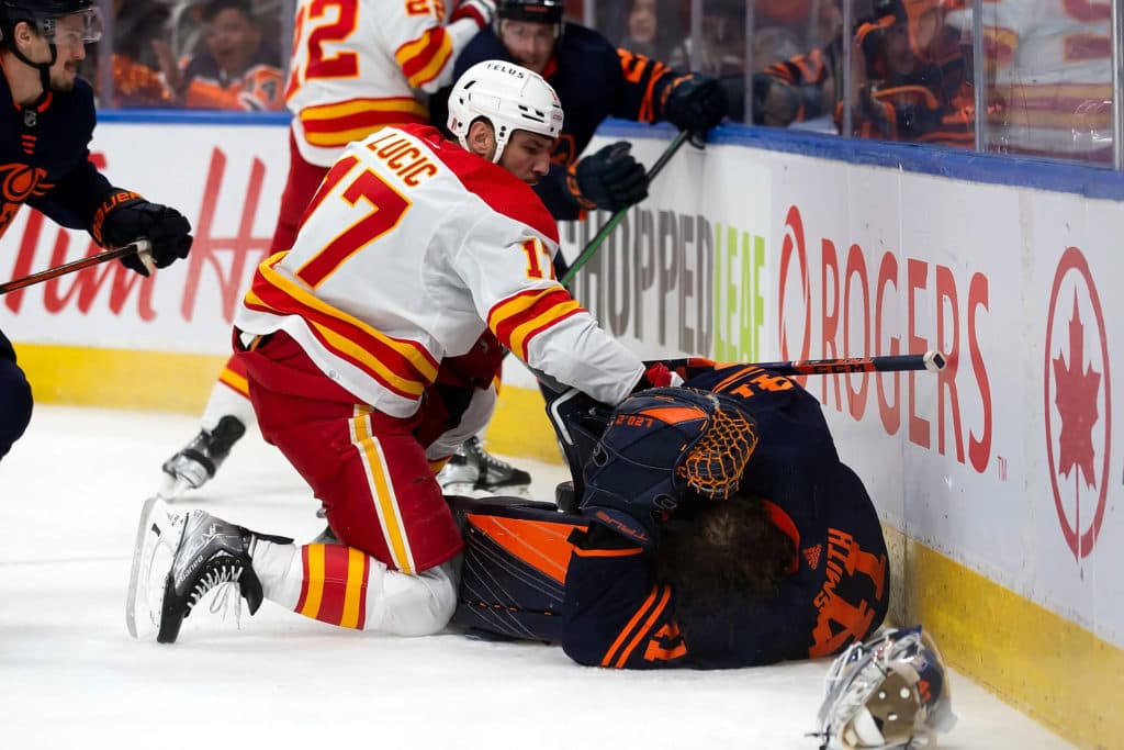 Milan Lucic smashes Mike Smith into the boards during the Flames-Oilers playoff game.