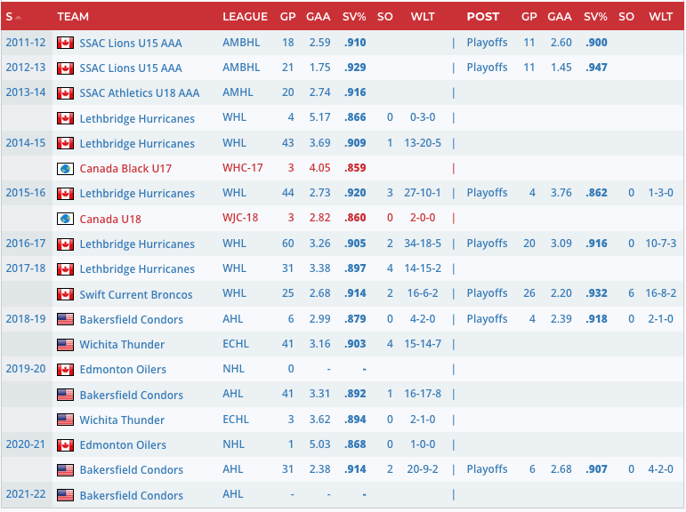 Finally, in 2021, Skinner broke out as a pro, posting a .914 save percentage over 31 starts for the Bakersfield Condors. There’s some valid skepticism around last season’s AHL results because of how many quality players were stashed on NHL taxi squads, but Skinner’s performance has him in a much better spot today than where he was last year.