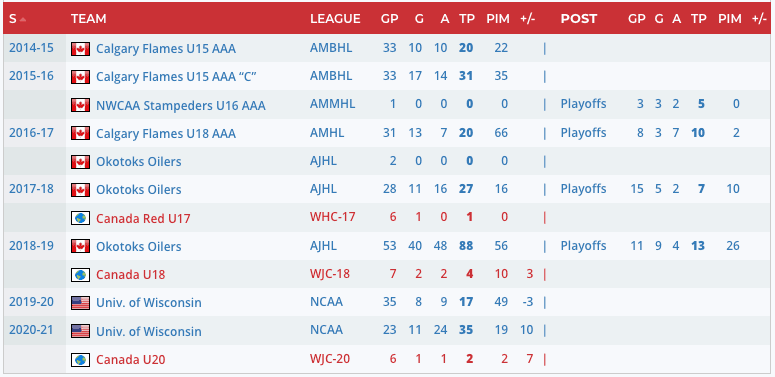 Holloway then made the move to NCAA hockey for the 2019-20 season, joining the Wisconsin Badgers. At a glance, his eight goals and 17 points over 35 games looks fairly pedestrian, but it’s important to point out that Holloway was one of the youngest players in the league. The majority of high-scoring Freshmen such as Cole Caufield, Alex Newhook, and Alex Turcotte were January and February birthdays, while Holloway was born in September.