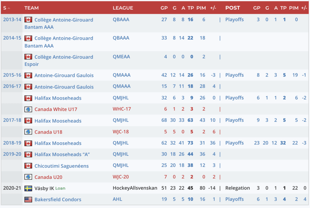 Being a late-September birthday, Lavoie was already in his third go-around of the QMJHL in his draft year. In 2018-19, he scored 30 goals and 63 points in 68 games with the Halifax Mooseheads, and then he improved slightly in 2019-20 to 32 goals and 73 points over 62 games. That season also featured a playoff run in which Lavoie buried 20 goals in 23 games.