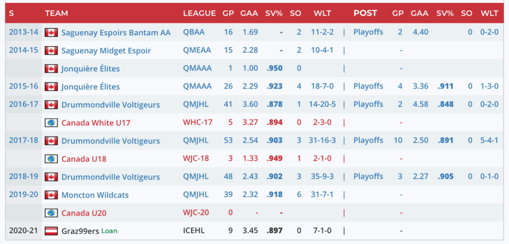 In 2019-20, Rodrigue was putting together an incredible season for the Moncton Wildcats before the season got wiped due to COVID-19. Rodrigue posted a 31-7-1 record and a sparkling .918 save percentage, which is incredibly impressive for the high-scoring QMJHL.