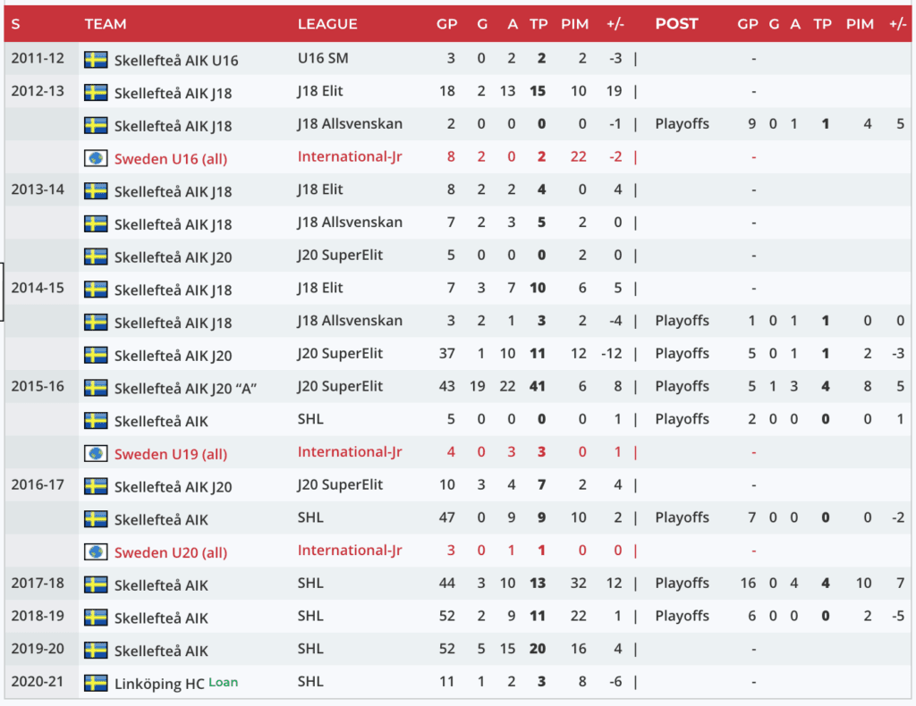 Beyond the fact that they’re both Swedish defencemen who were selected a few picks apart, Berglund had similar numbers to Gustafsson in the Swedish Elite League at the same age. In his age 22 season in 2014-15, Gustafsson averaged 19:15 per game and recorded 29 points and a plus-two rating in 55 games. Berglund, on the other hand, put up 20 points and a plus-four rating in 52 games and averaged 18:20 in his age 22 season in 2019-20.