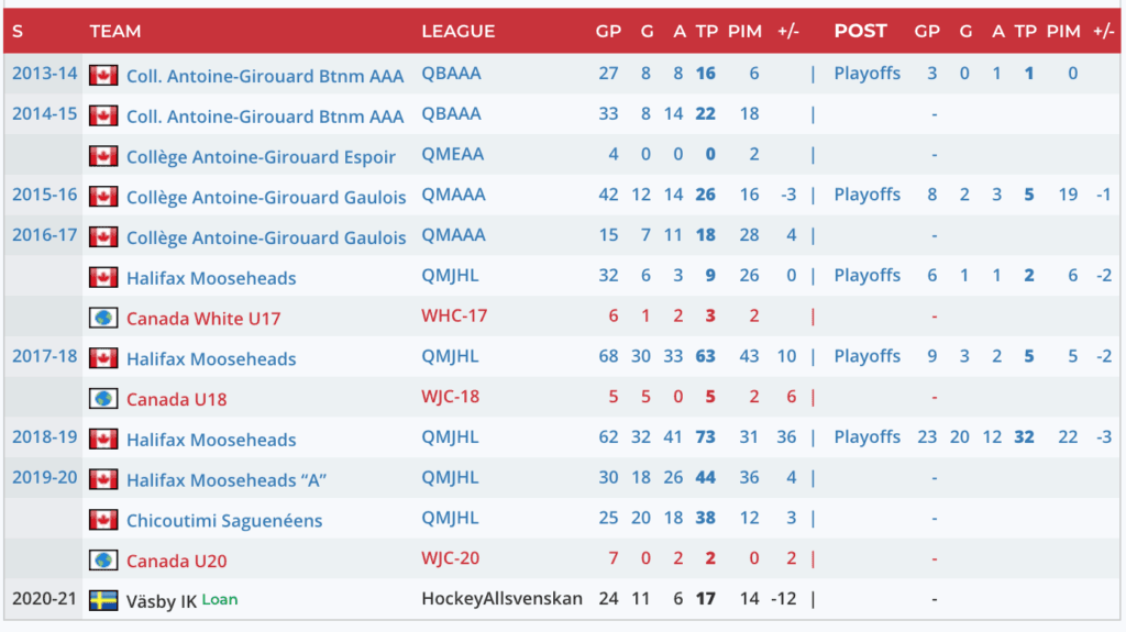 A late-September birthday, Lavoie just narrowly missed being eligible for the 2018 draft. After putting up a solid, 63-point season for the Halifax Mooseheads in 2017-18, Lavoie broke out as an 18-year-old in the QMJHL.