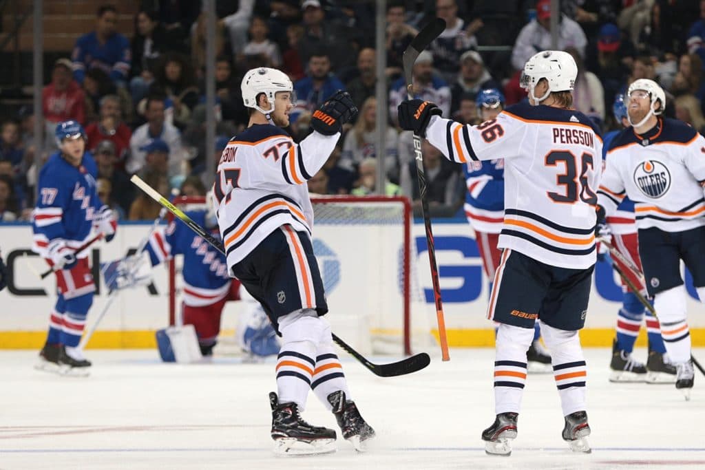 Oct 12, 2019; New York, NY, USA; Edmonton Oilers defenseman Oscar Klefbom (77) celebrates his goal against New York Rangers goaltender Henrik Lundqvist (30) with defenseman Joel Persson (36) during the second period at Madison Square Garden. Mandatory Credit: Vincent Carchietta-USA TODAY Sports
