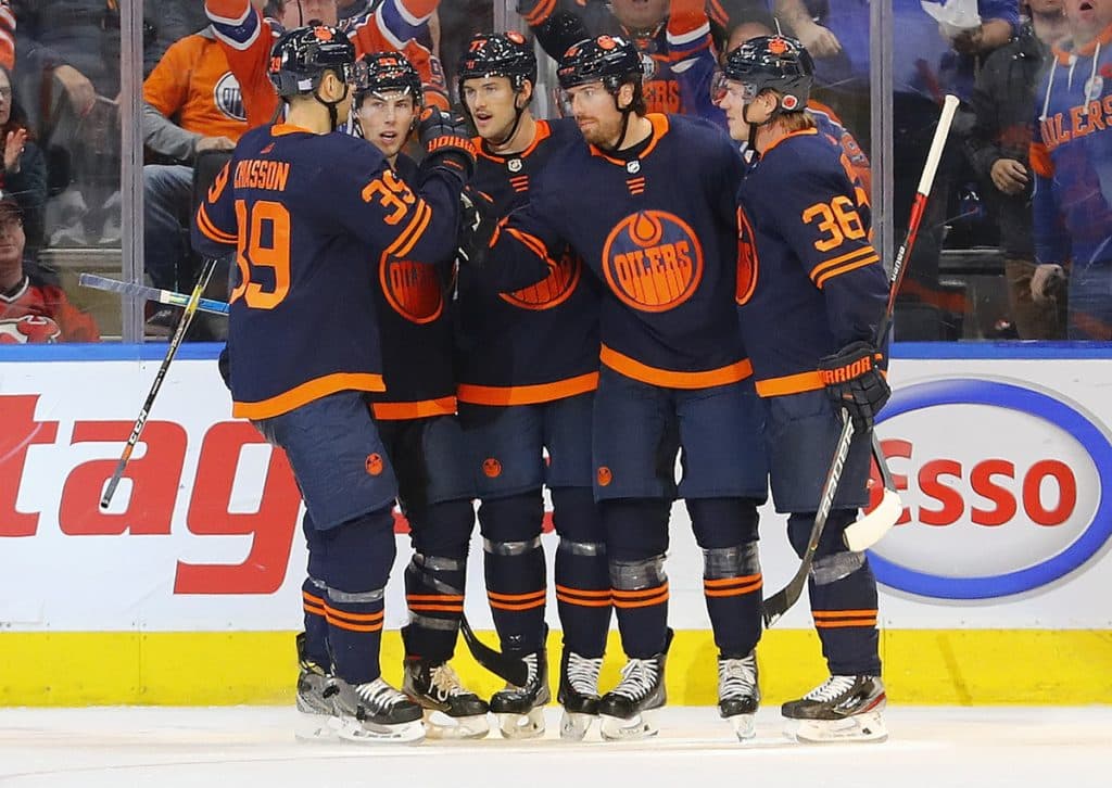 Nov 8, 2019; Edmonton, Alberta, CAN; The Edmonton Oilers celebrate a second period goal by forward James Neal (18) against the New Jersey Devils at Rogers Place.