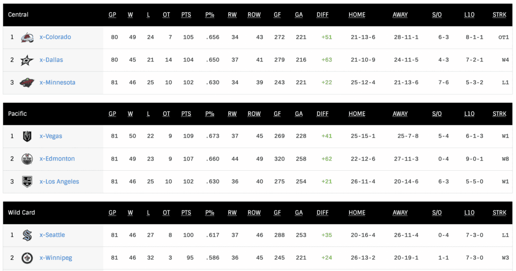 The Golden Knights can clinch the top spot in the Pacific and the West simply by picking up a point in their game in Seattle against the Kraken on Thursday. In order for the Oilers to jump the Golden Knights, they need Seattle to beat Vegas in regulation and they need to win their game on Thursday with the San Jose Sharks. That would put both teams at 109 points but Edmonton has the tiebreaker in regulation wins.