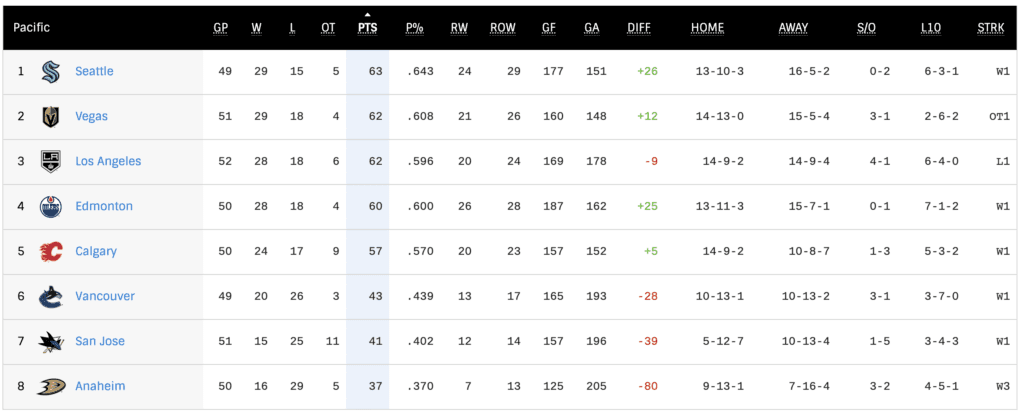 The Oilers still maintain the first wildcard spot, with the Flames trailing by three points. The Pacific division itself is an utter dog race, with the Seattle Kraken with 63 points (49 games played), the Vegas Golden Knights (51 games played) and LA Kings (52 games played) with 62 points, and the Oilers (50 games played) with 60 points.