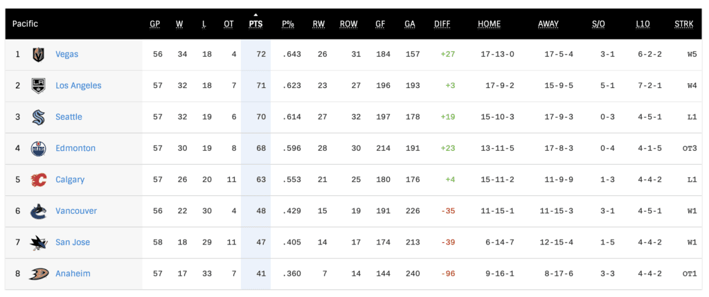 Here are the Pacific Division Standings as of Monday, February 20th…