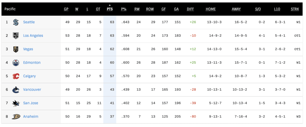 There are no interesting notes on the Kraken, other than that they lead the Pacific Division with 63 points. Well, they’re actually tied with the Los Angeles Kings but have played four fewer games.