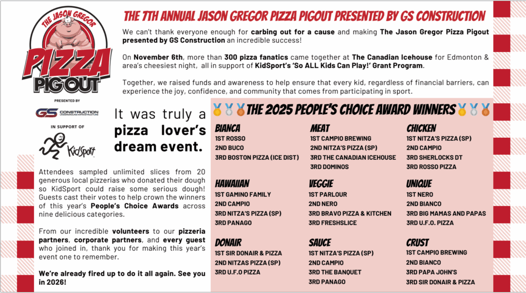 The seventh annual Pizza Pigout was a sellout. It was a great night supporting KidSport. Thank you to all who purchased tickets, to our title sponsor GS Construction, all of our other sponsors and to the Icehouse for hosting. And a massive shout-out to the pizzerias that donated all the pizza. It was amazing.