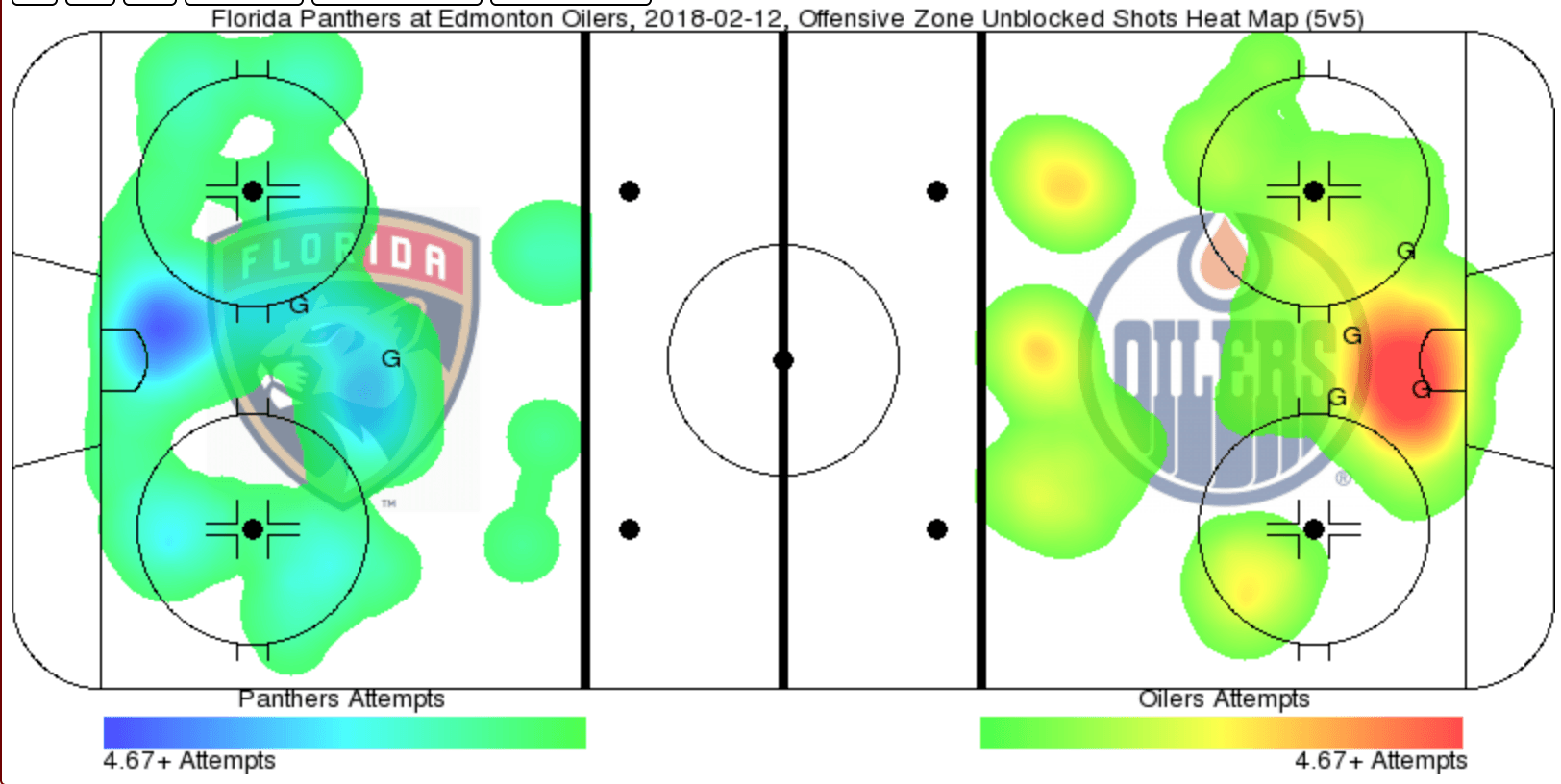 The Panthers were the better team in the first period, controlling the shot attempts at even strength 24 to 18. It was split evenly 17 to 17 in the second period, then, in the third, the Oilers put their foot on the gas and had 28 shot attempts to Florida’s 15. Of course, even strength didn’t matter a hell of a lot because Edmonton’s penalty kill was junk again. Florida had four power play opportunities and they scored on three of them. The Oilers didn’t get a single chance on the power play all game, as the only call that went in their favour was Draisaitl’s penalty shot.