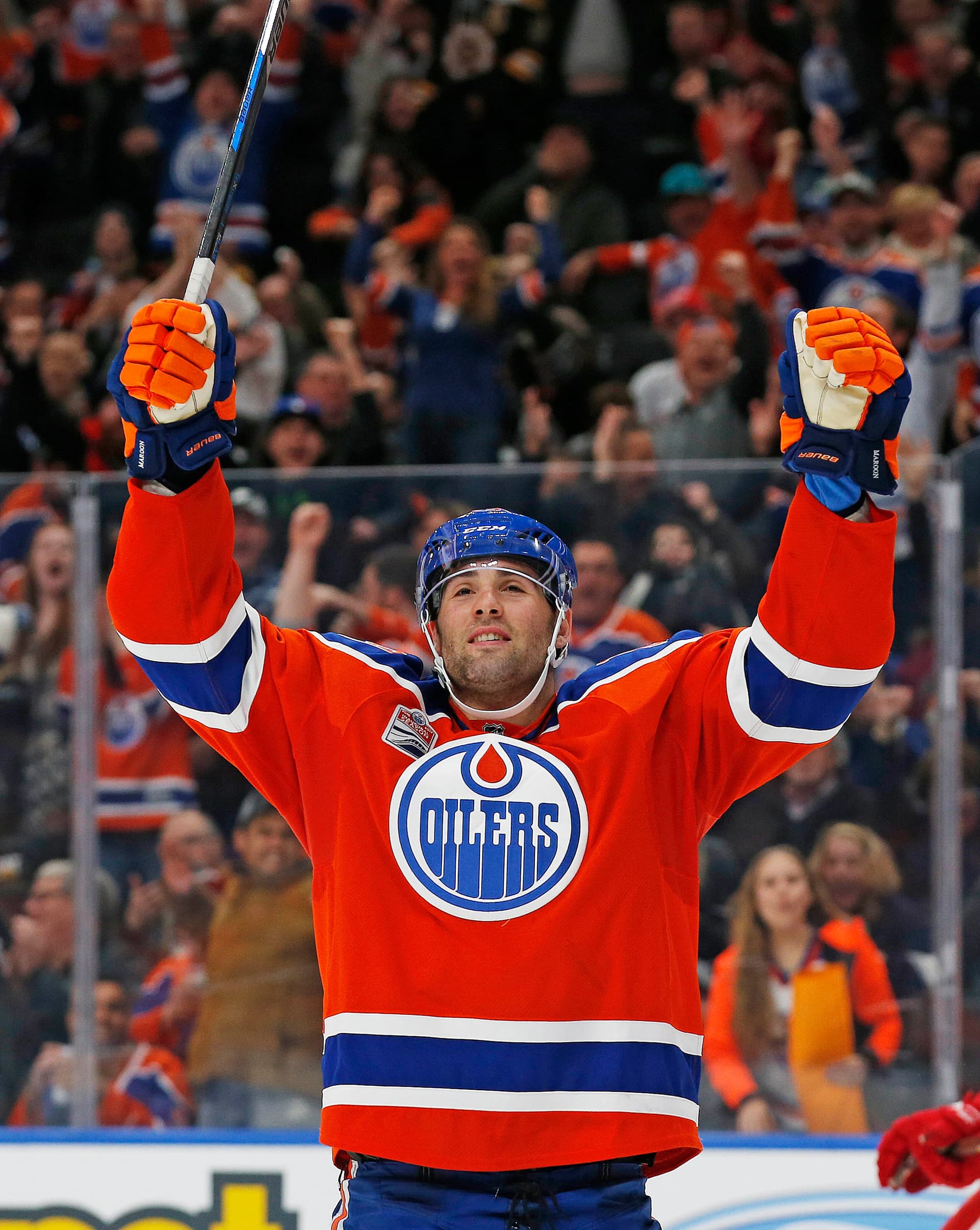Mar 4, 2017; Edmonton, Alberta, CAN; Edmonton Oilers forward Patrick Maroon (19) celebrates his third period goal against the Detroit Red Wings at Rogers Place. Mandatory Credit: Perry Nelson-USA TODAY Sports