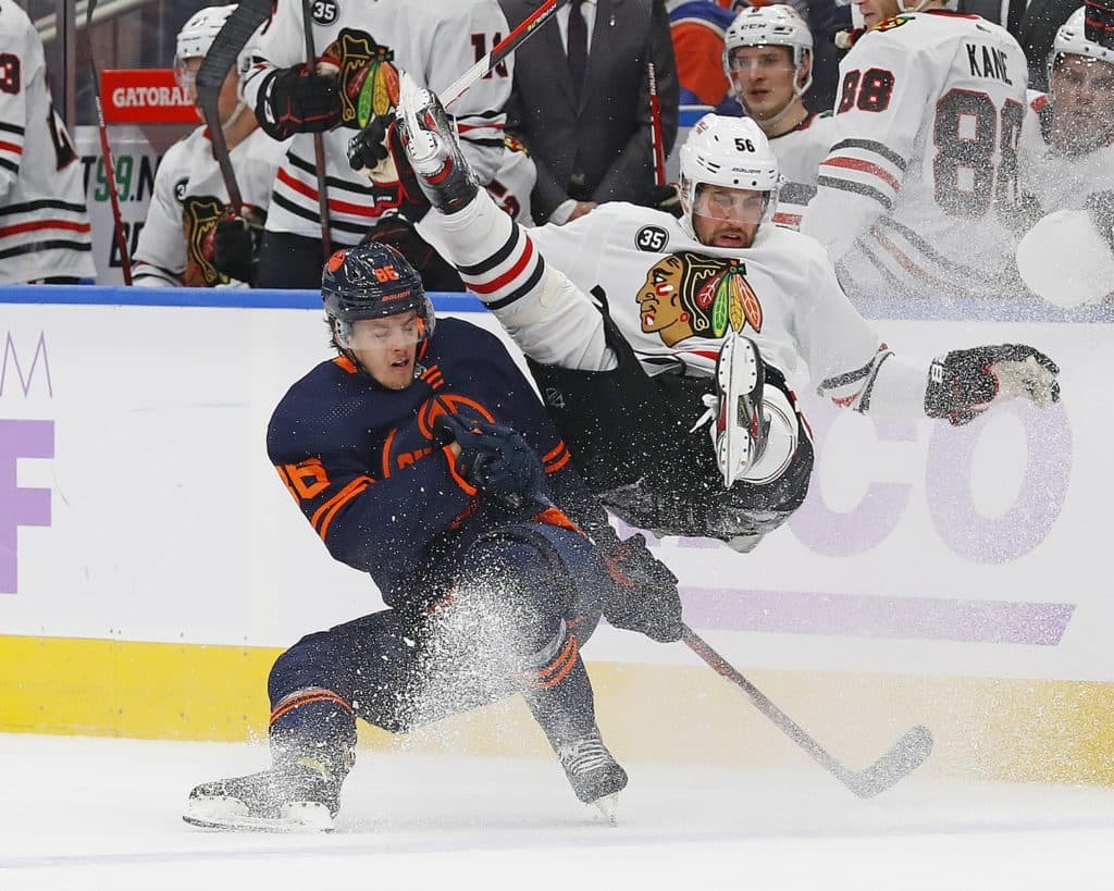 Nov 20, 2021; Edmonton, Alberta, CAN; Edmonton Oilers defensemen Philip Broberg (86) checks Chicago Blackhawks defensemen Erik Gustafsson (56) during the third period at Rogers Place. Mandatory Credit: Perry Nelson-USA TODAY Sports