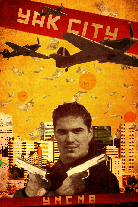 EEEE!!!! Soviet propaganda! Edmonton Skyline with superimposed cash raining down! YMCMB banner appeasing the sole judge! Cross handed pistols held in the pimpingest way possible showing us all that Yak is a man who will shoot first and look gangster shortly thereafter.