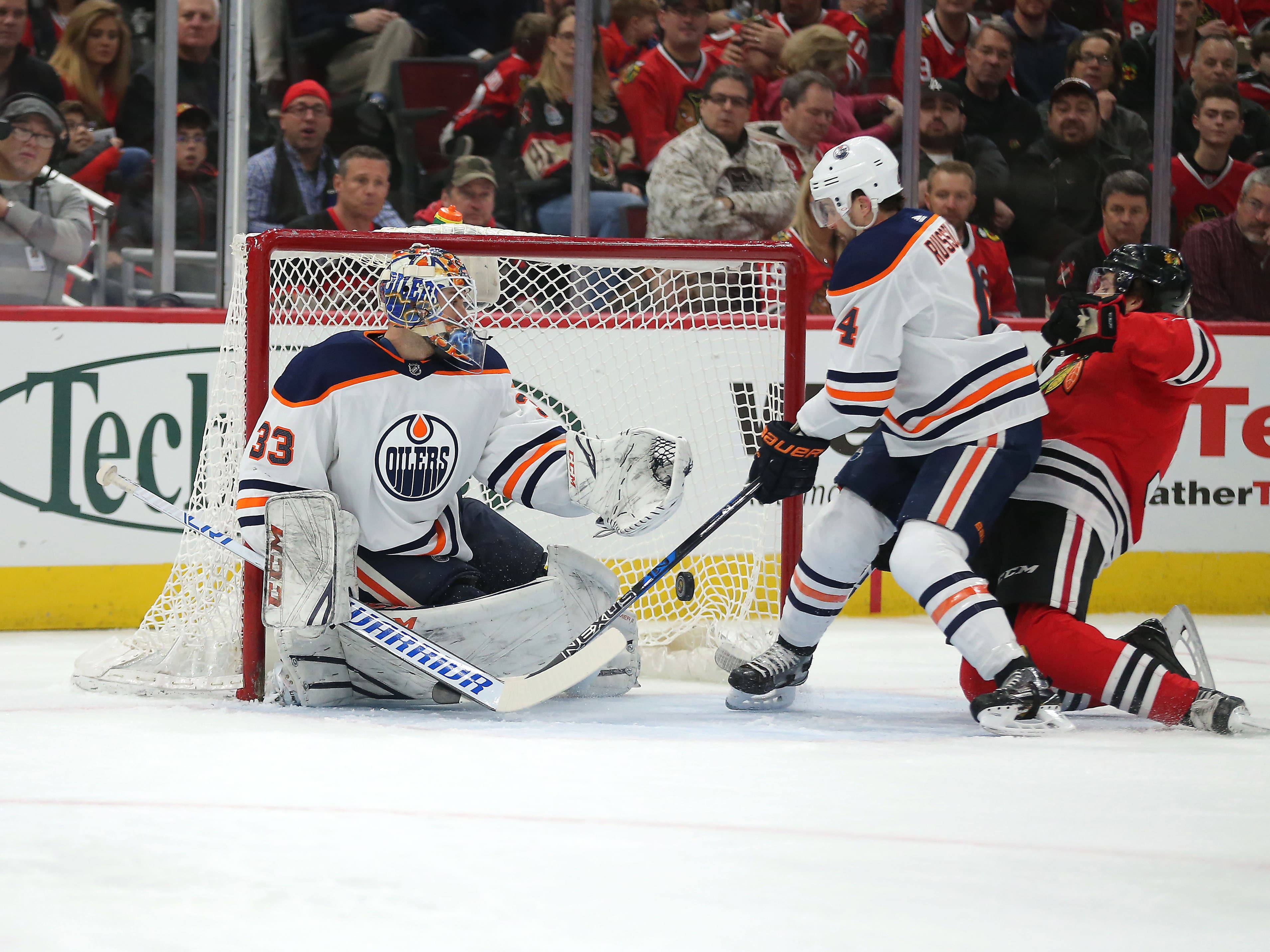 Jan 7, 2018; Chicago, IL, USA; Chicago Blackhawks right wing Ryan Hartman (38) shoots on Edmonton Oilers goalie Cam Talbot (33) with defenseman Kris Russell (4) defending during the first period at the United Center. Mandatory Credit: Dennis Wierzbicki-USA TODAY Sports