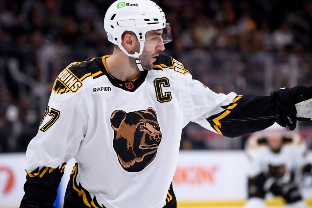 Nov 7, 2022; Boston, Massachusetts, USA; Boston Bruins center Patrice Bergeron (37) directs his teammates prior to a face-off during the first period against the St. Louis Blues at TD Garden. Mandatory Credit: Bob DeChiara-USA TODAY Sports