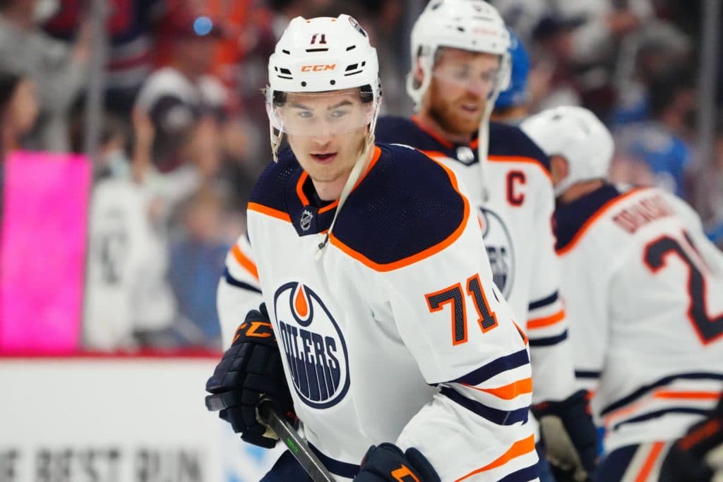 Jun 2, 2022; Denver, Colorado, USA; Edmonton Oilers center Ryan McLeod (71) warms up before the game against the Colorado Avalanche in game two of the Western Conference Final of the 2022 Stanley Cup Playoffs at Ball Arena. Mandatory Credit: Ron Chenoy-USA TODAY Sports