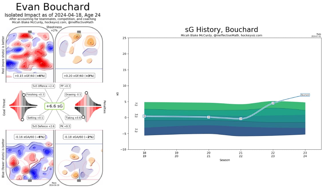 In the middle of the chart, there’s a sG value, which is an “all-in-one” statistic to evaluate a player’s current value, with 0 representing a slightly below-average third-line forward, or an average second-pairing defenceman. This is an important distinction, as other models, such as Wins Above Replacement (WAR) or Goals Above Replacement (GAR), are also descriptive of a player’s past. sG values are also placed on a player’s finishing (scoring), setting (passing), 5v5 offence and defence, power play, penalty kill, as well as drawing and taking penalties. Evan Bouchard’s +6.2 sG shows him contributing at a rate beyond that of a first-pairing defenceman, as seen in the sG History chart, which also highlights his value over time.