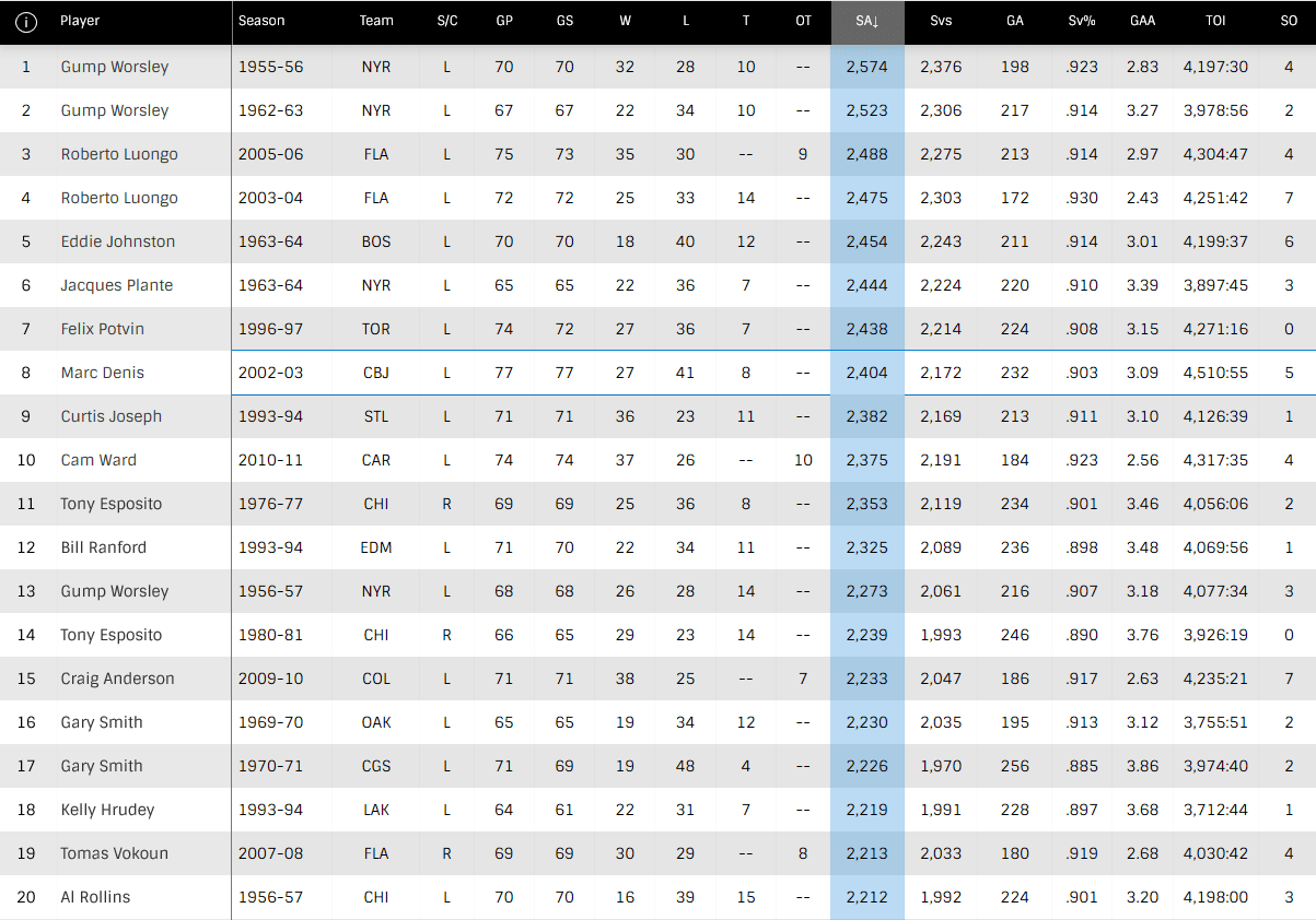 Gump Worsley — what a great name — faced the most shots in a single NHL season. He holds down the top-two spots, followed by Roberto Luongo. Those 2004 and 2006 Panthers teams were not very good. Here is a list of the top-20 most shots faced in a season.