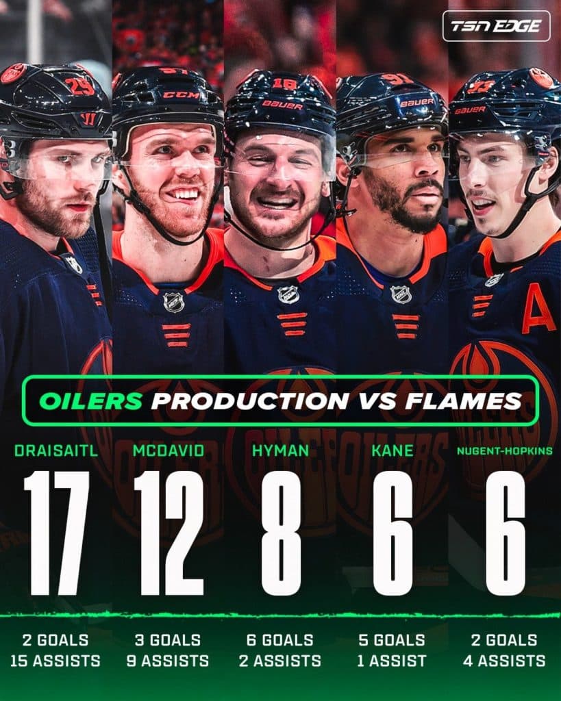 Another one of my favourite things about this series was the bulletin board material that the Flames kept giving our boys bulletin board material throughout the series, and there was no better example than Tkachuk and Andersson saying that “one guy” beat them after the Game 3 dismantling. Well, as it turns out, that ‘one guy’ ended up being a lot of different guys as the Oilers were able to get key contributions from basically everyone they had in the top six. Whether it was @Evander Kane pumping home five goals (5G, 1), @Zach Hyman scoring in every single game (6G, 2A), or Ryan Nugent-Hopkins bookending Game 4 with a pair of clutch markers (2G, 4A), the Oilers got more contributions from throughout their lineup than the Flames did and it wasn’t particularly close. From my side of the TV screen, our side got the performances they needed by key players whereas the opposition can’t really say the same.