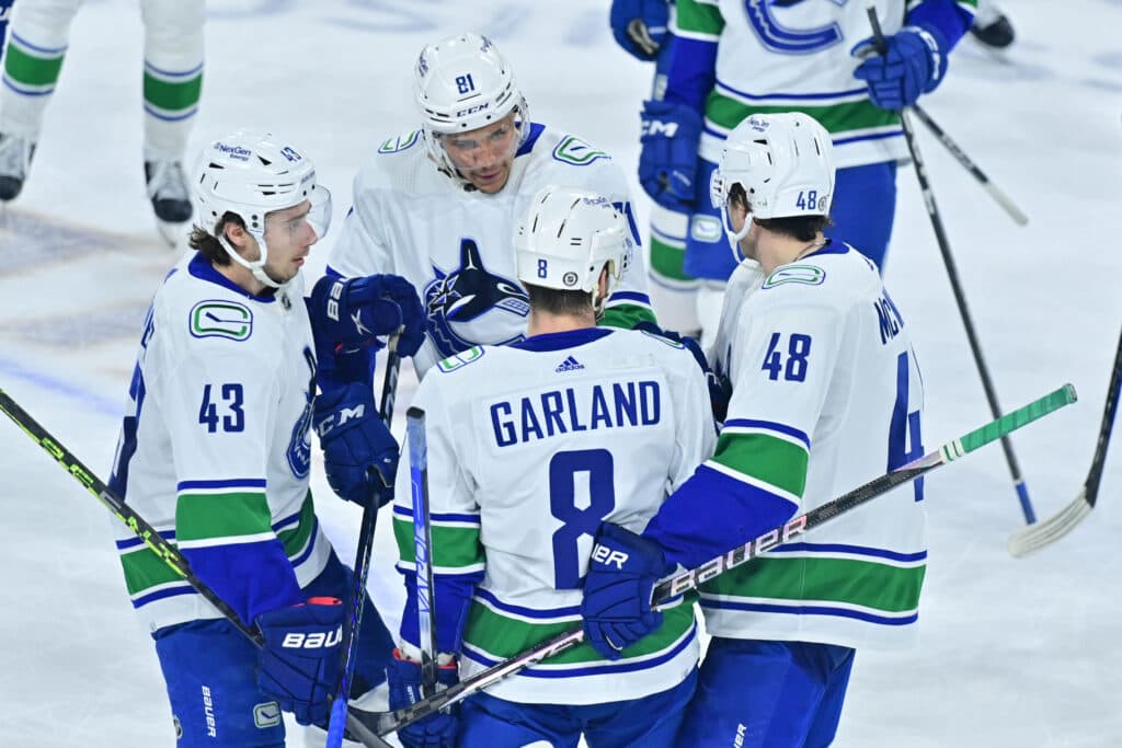 Apr 13, 2023; Tempe, Arizona, USA; Vancouver Canucks right wing Conor Garland (8) celebrates with defenseman Quinn Hughes (43) and defenseman Cole McWard (48) and center Dakota Joshua (81) after scoring the game winning goal in overtime against the Arizona Coyotes at Mullett Arena. Mandatory Credit: Matt Kartozian-USA TODAY Sports