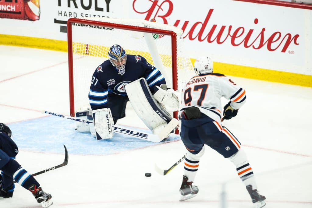 May 24, 2021; Winnipeg, Manitoba, CAN; Edmonton Oilers forward Connor McDavid (97) skates in on Winnipeg Jets goalie Connor Hellebuyck (37)) during the third period in game four of the first round of the 2021 Stanley Cup Playoffs at Bell MTS Place. Mandatory Credit: Terrence Lee-USA TODAY Sports