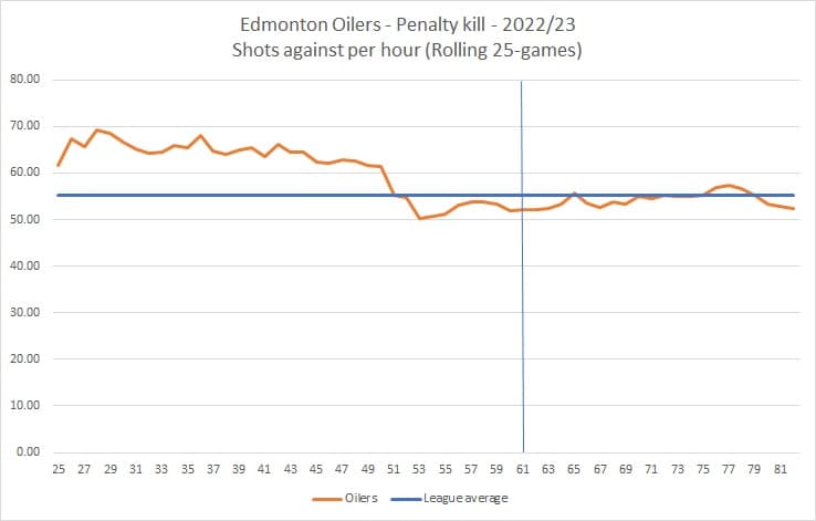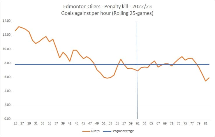 But from that period onwards, the Oilers penalty kill saw their rate of goals against gradually decline, at one point posting a goals-against rate around 6.00, basically half of what they were initially allowing, and similar to what some of the best penalty-killing teams finished the season with. The graph below shows the Oilers rate of goals against over 25-game rolling periods. The blue line across represents the league average rate in the season. The vertical blue line represents when the trade deadline occurred.