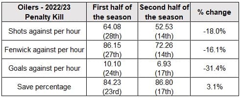 In the first half of the 2022/23 regular season, the Oilers penalty kill ranked poorly in terms of process and results. They were allowing some of the highest rates of shots and chances against, the goaltending was poor, and the goals-against rate was ninth highest in the league.