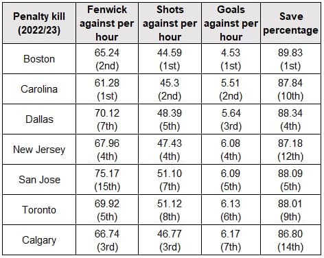 The top penalty-killing teams like Boston, Carolina, Dallas and New Jersey were very successful last season largely because of their tactical and player deployment, which helped minimize the rate of shots and chances their goaltenders faced. All four clubs ranked highly when it came to unblocked shot attempts (i.e., Fenwick) and actual shots on goal against. The table below lists the top seven penalty-killing teams from last season, sorted by their goals against per hour. Included in the table is each team’s rate of unblocked shot attempts and shots on goals against, along with their league-wide ranking.