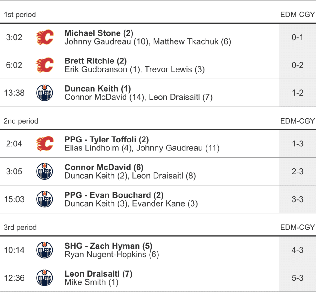 - @Duncan Keith cut Calgary’s lead in half (2-1) with a blast from the circle that beat Markstrom on the glove side after McDavid found him streaking in from the point and hit him with a perfect pass despite being one-handed. Keith honestly had a very good night for the Oilers as he ended up with three points on the night to go along with 18:25 in TOI.