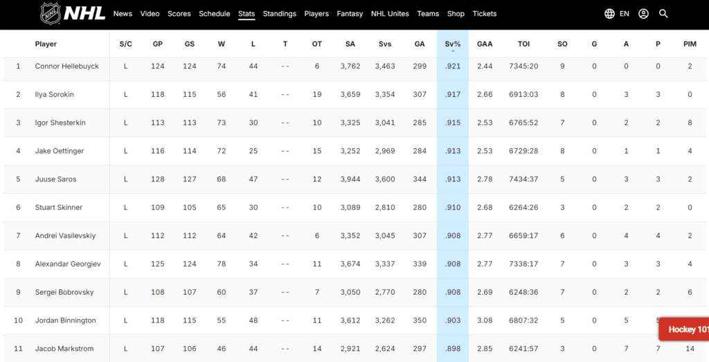 So let’s look at the past two regular seasons. Did you know Skinner is one of only 11 goalies who played 100+ games? Here is the list of those 11 goalies. Check where he ranks in Sv% and GAA.