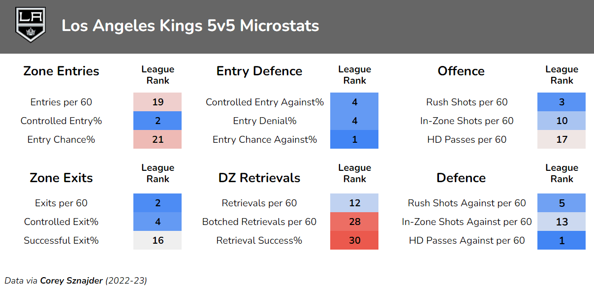 Furthermore, the Kings aren’t as successful at defending shots off the forecheck/cycle as opposed to shots off the rush, and while they’re efficient at exiting the zone with control, they don’t have the highest exit success rate. Some important things to note.