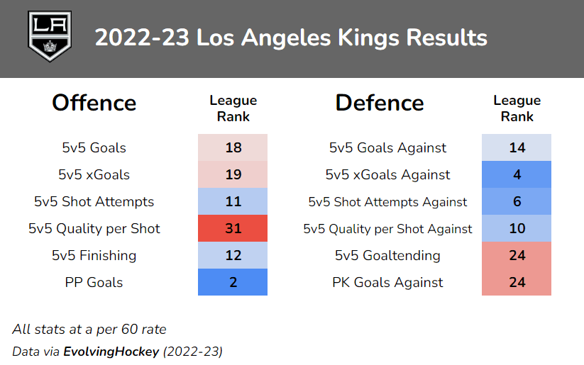 First, let’s talk about the offence. The Kings aren’t particularly an elite offensive team at even strength, ranking 18th in the league in 5v5 goals per hour. Their expected goal rate is 19th in the league. They’re 11th in shot attempt volume, but second last in the league in average quality per shot attempt.
