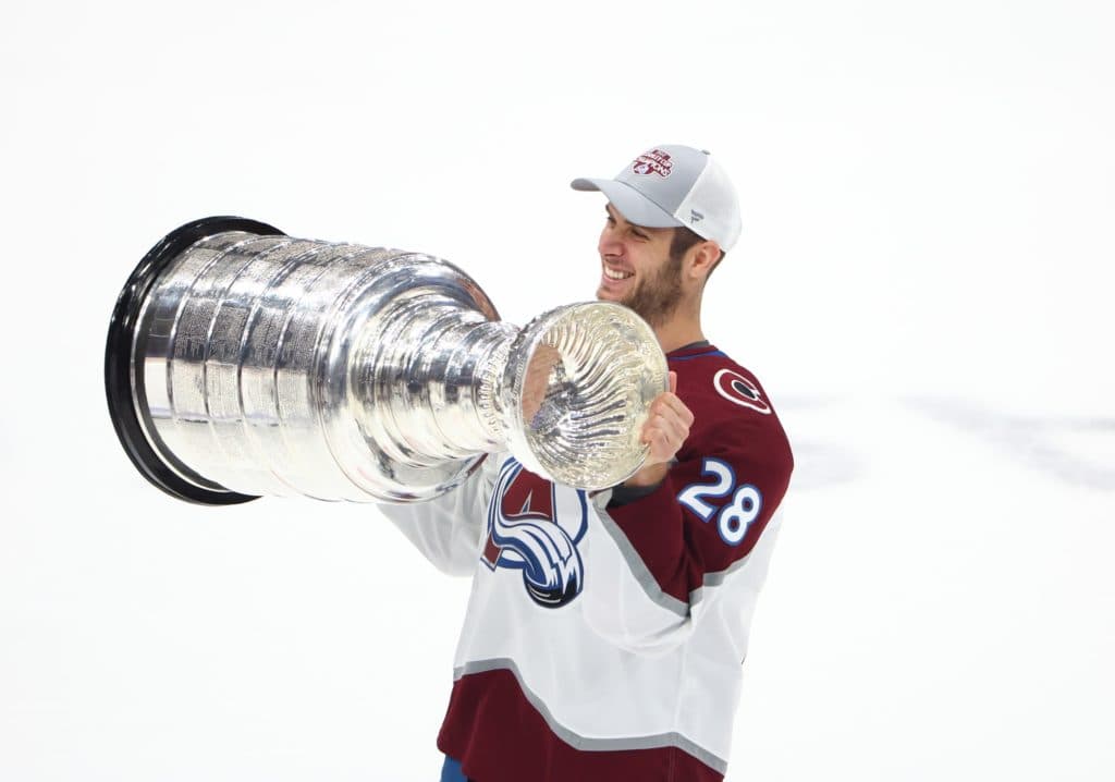 Jun 26, 2022; Tampa, Florida, USA; Colorado Avalanche defenseman Ryan Murray (28) celebrates with the Stanley Cup trophy after defeating the Tampa Bay Lightning during game six of the 2022 Stanley Cup Final at Amalie Arena. Mandatory Credit: Mark J. Rebilas-USA TODAY Sports