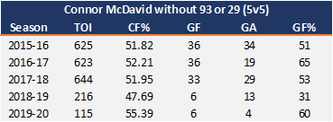 McDavid plays just fine without Draisaitl or Nugent-Hopkins for most of his career, save for 2018-19. McDavid generates good shot numbers and outscores the opposition well enough. He doesn’t need another elite forward on his line. Sure, it would be nice, but the lack of scoring forwards means Tippett should explore other combinations.