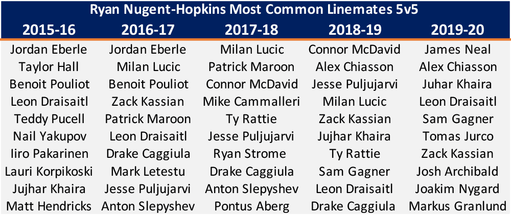 There’s no point relitigating Chiarelli’s mistakes, but the loss of Eberle and Hall hurt Nugent-Hopkins. Nugent-Hopkins’ career year came unsurprisingly when McDavid was his most common linemate five-on-five. He doesn’t have a linemate of that calibre in 2019-20.