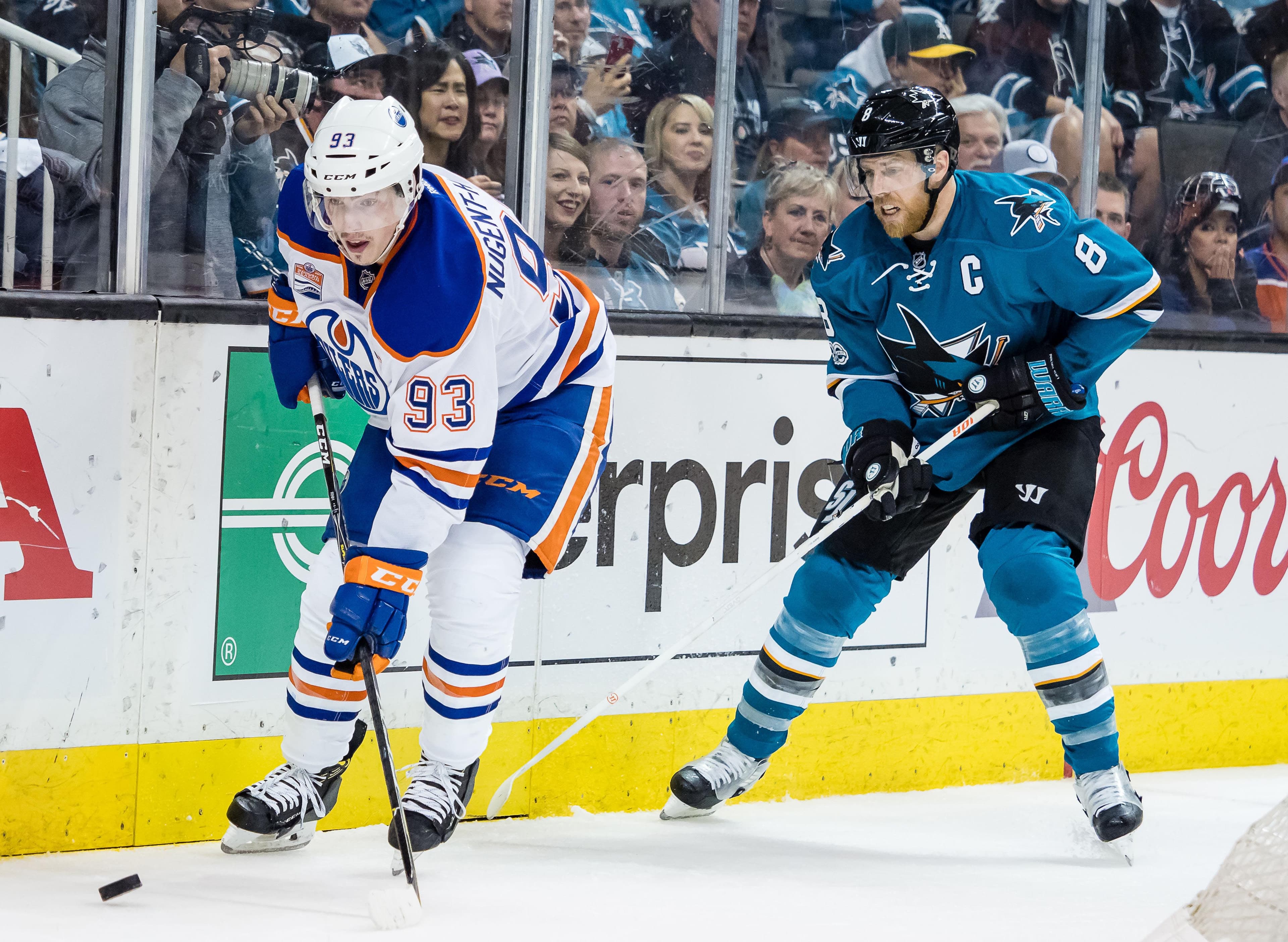 Apr 22, 2017; San Jose, CA, USA; Edmonton Oilers center Ryan Nugent-Hopkins (93) controls the puck ahead of San Jose Sharks center Joe Pavelski (8) during the second period in game six of the first round of the 2017 Stanley Cup Playoffs at SAP Center at San Jose. Mandatory Credit: Kelley L Cox-USA TODAY Sports