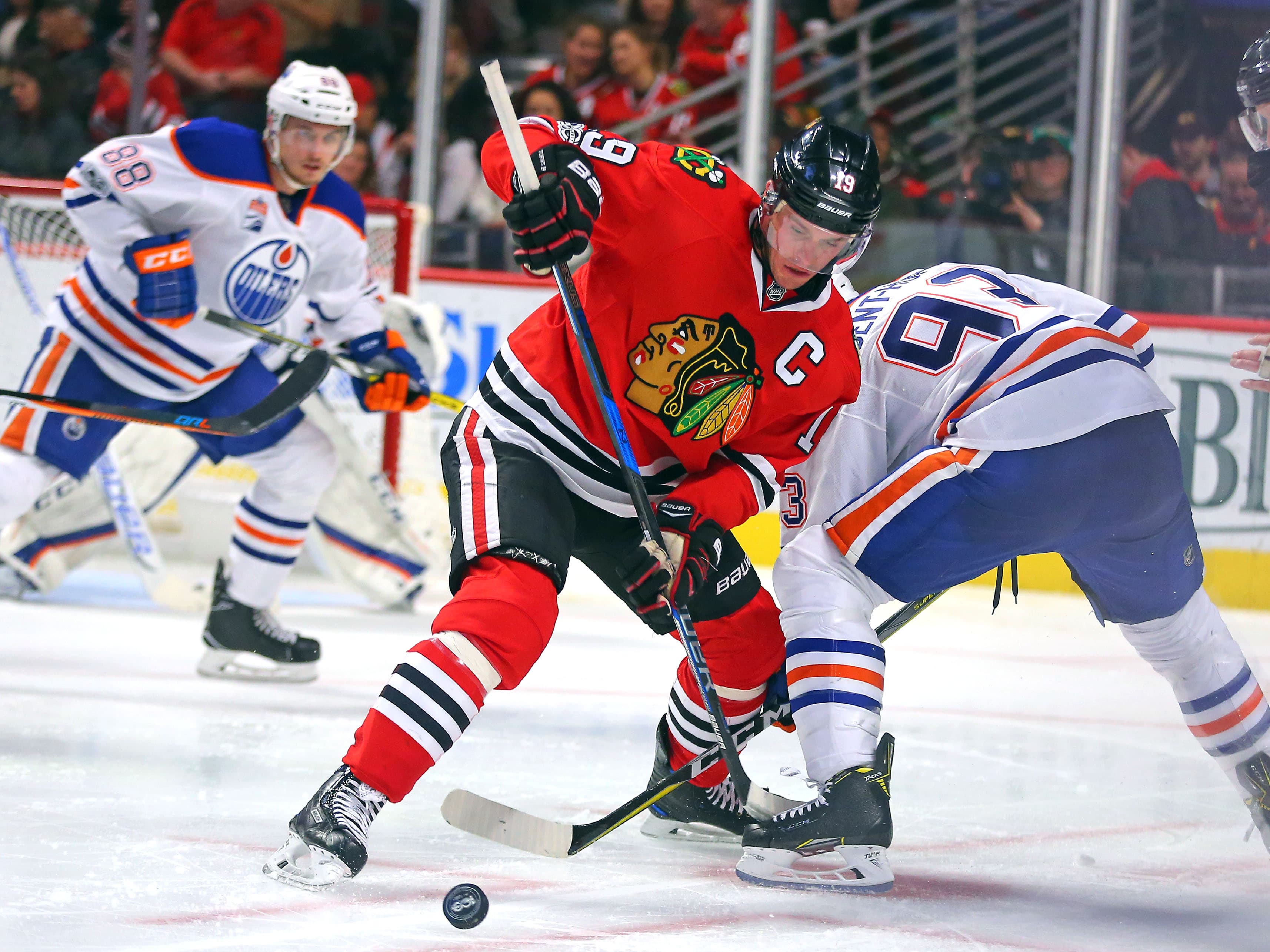 Feb 18, 2017; Chicago, IL, USA; Chicago Blackhawks center Jonathan Toews (19) and Edmonton Oilers center Ryan Nugent-Hopkins (93) fight for a face off during the third period at the United Center. Edmonton won 3-1. Mandatory Credit: Dennis Wierzbicki-USA TODAY Sports