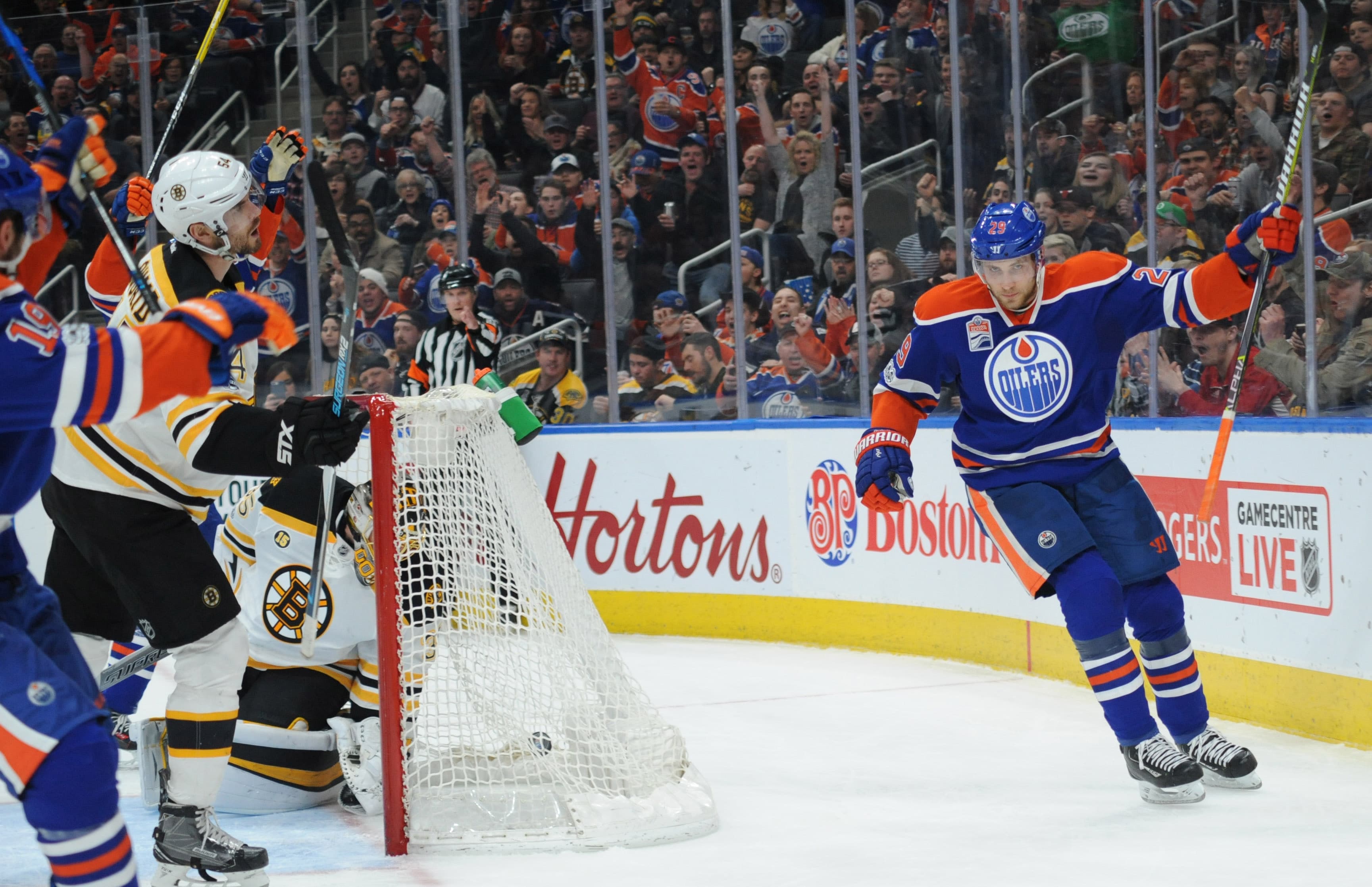 Mar 16, 2017; Edmonton, Alberta, CAN; Edmonton Oilers center Leon Draisaitl (29) celebrates after scoring a goal against Boston Bruins goalie Anton Khudobin (35) during the second period at Rogers Place. Mandatory Credit: Walter Tychnowicz-USA TODAY Sports
