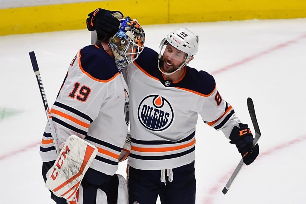 Dec 1, 2019; Vancouver, British Columbia, CAN; Edmonton Oilers forward Sam Gagner (89) congratulates goaltender Mikko Koskinen (19) for the win after the third period at Rogers Arena. Mandatory Credit: Anne-Marie Sorvin-USA TODAY Sports