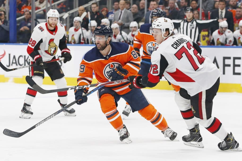 Dec 4, 2019; Edmonton, Alberta, CAN; Ottawa Senators defensemen Thomas Chabot (72) and Edmonton Oilers forward Sam Gagner (89) look for a loose puck during the first period at Rogers Place. Mandatory Credit: Perry Nelson-USA TODAY Sports