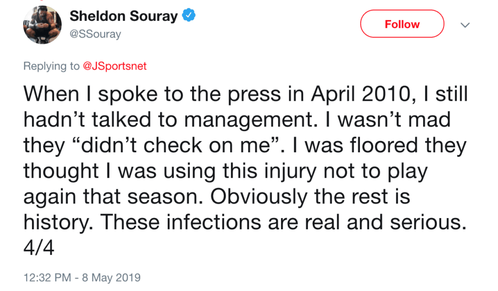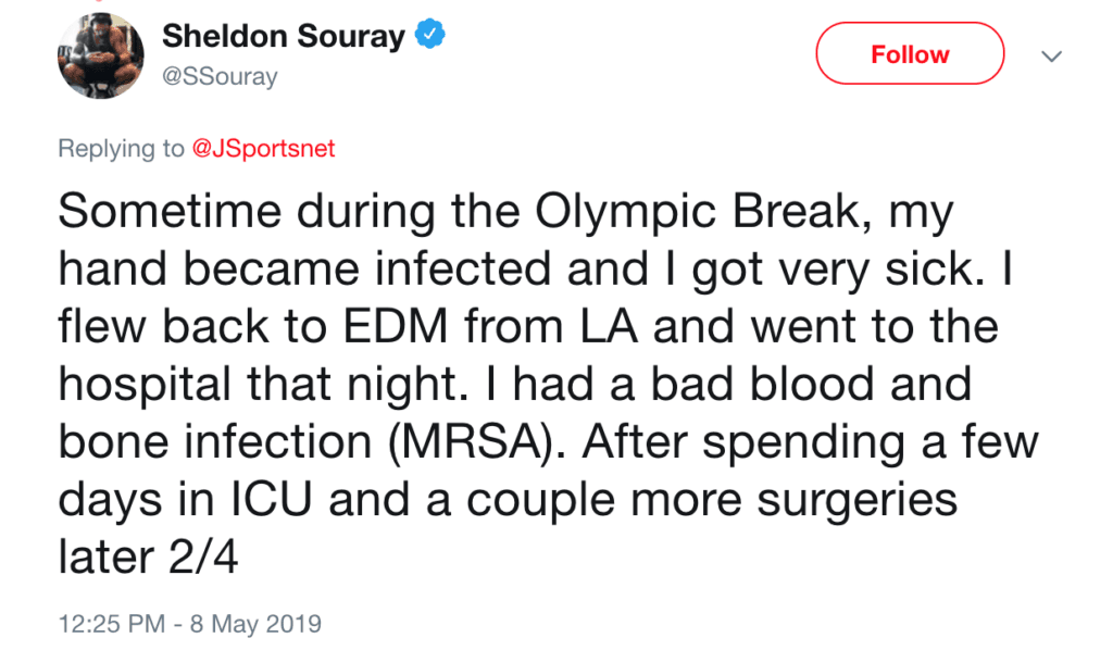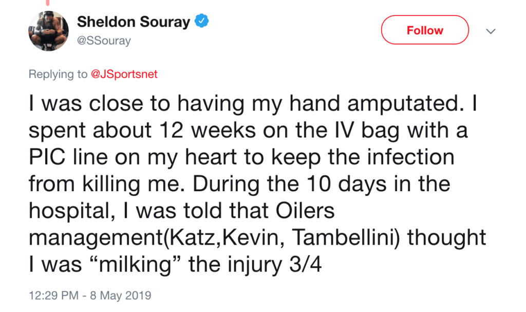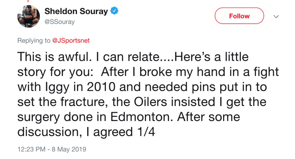 Today, in response to John Shannon tweeting about Daryl Katz’s health, Souray opened up about his personal experience dealing with an injury while with the Oilers. According to Souray, he suffered a hand injury in a fight and, after surgery, it got infected. He said the infection was so bad he nearly had to have his hand amputated and he spent 12 months with an IV bag to keep the infection from spreading to his heart. While all this was going on, Souray said he had heard Oilers management thought Souray was milking the injury to get out of having to play. Interesting how he tweeted he heard that, but didn’t mention if he asked them if they felt that way.