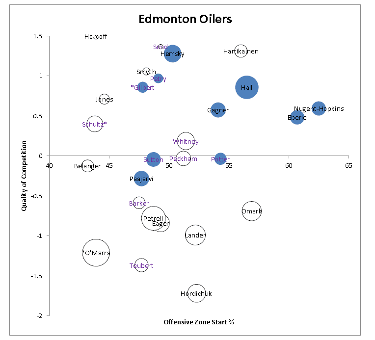 We identified some good things here in April but Derek takes those numbers and shows us a different way of looking at things–and I think a more effective way. In the middle of a season that saw him spend time in the minors, Magnus Paajarvi was a blueboy, a possession winner. The Vollman Sledgehammer graph bears out the same information, and Derek further pushes Paajarvi’s case here.