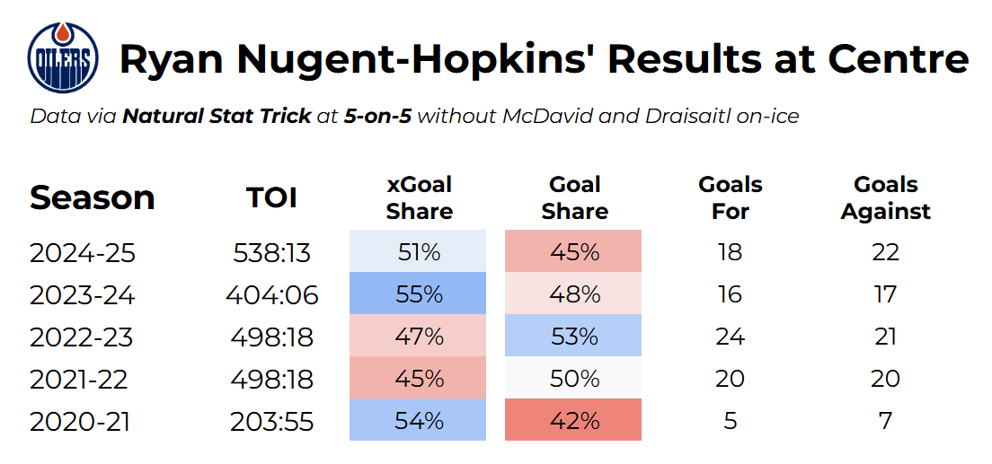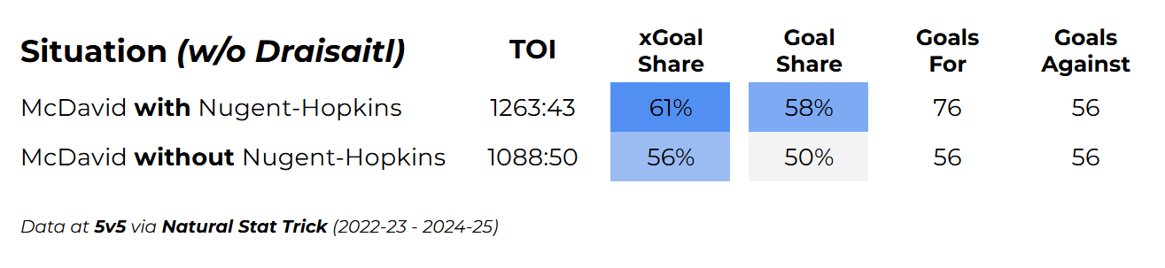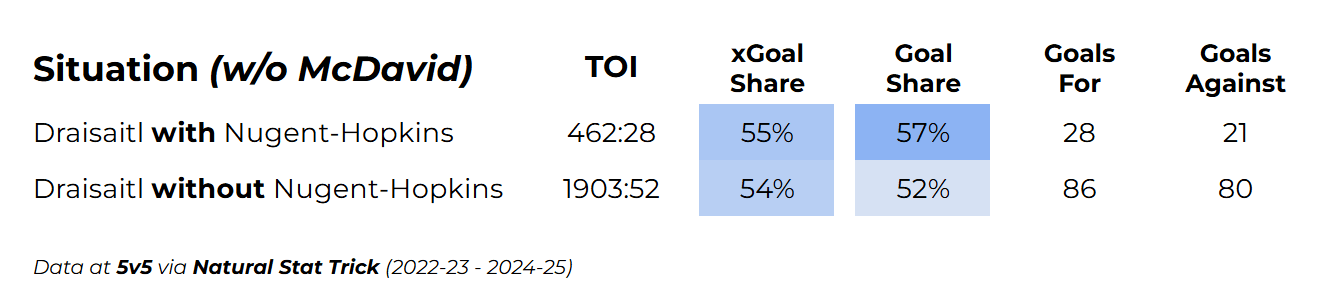 The most compelling argument for keeping Nugent-Hopkins on the wing is the most straightforward one: McDavid and Draisaitl both see a significant improvement in their results with RNH on their wings.
