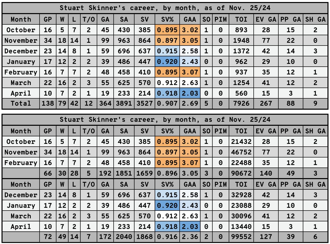 In those months, Skinner has posted a 30-28-5 record, a .896 save percentage and a 3.05 goals against average. In December, January, March and April? A 49-14-7 record, a .916 save percentage and a 2.36 goals-against average.