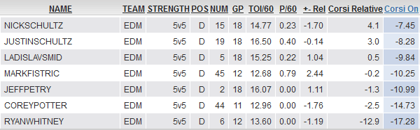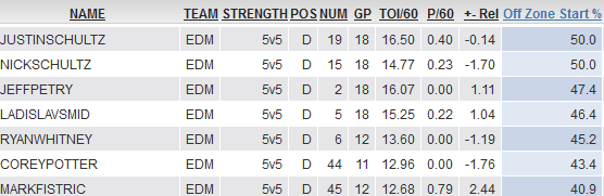 Smid’s value shows here, the guy is playing big minutes shorthanded (9th in the entire NHL so far this season). His combined total (EV and PK) is a strong indication that the Oilers see him as being one of their most valuable players defensively.