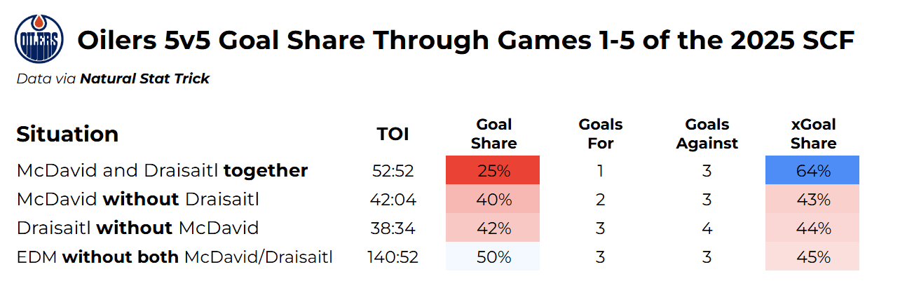 Of course, you can obviously cut Draisaitl some slack after scoring both OT game-winning goals in Games 1 and 4. But nevertheless, they need him and especially McDavid to be substantially better at 5-on-5. I don’t ever like criticizing these two after everything they have done for this team, but there’s just no other way to say it. The injury to Hyman has undeniably hurt their play, but even with the wingers they’ve had, it’s not unreasonable at all to at least expect a positive goal differential from those two. Unless the powerplay goes supernova, I can’t see a world where the Oilers win the cup with both McDavid and Draisaitl operating at a negative 5v5 GF%.