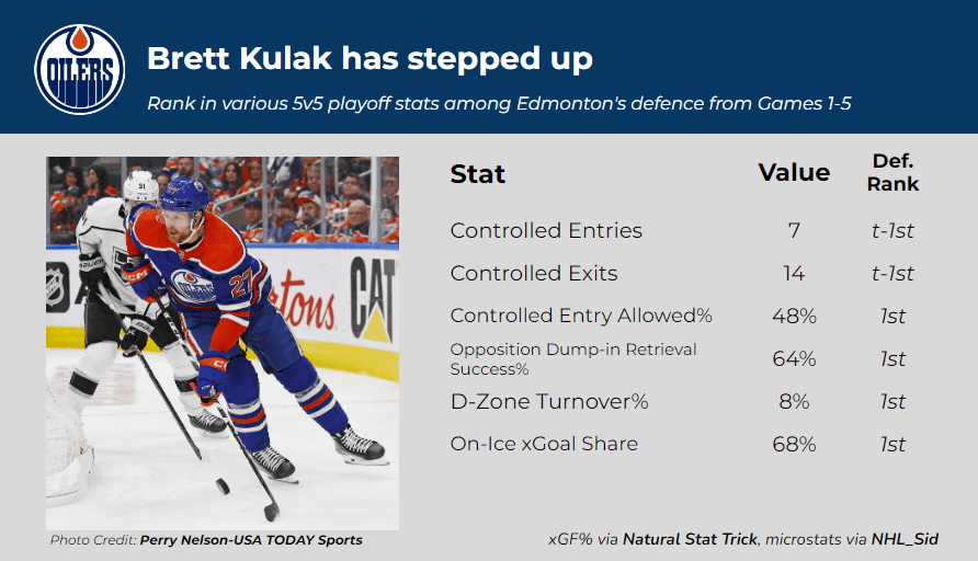 Not only is Kulak defending the rush well, as he usually does, he’s also rarely turning pucks over, consistently beating LA’s forecheckers to dump-ins against, and then moving the puck with success once he retrieves it. Furthermore, Kulak is tied with Evan Bouchard for first among Edmonton’s defencemen in controlled zone entries and controlled zone exits in less TOI. What impresses me the most about Kulak is his smooth skating abilities, and it’s certainly been on display in this series.
