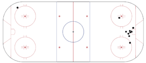 There is not much to Brind’Amour’s game. He plays a simple style and finally found his role at Quinnipiac, which helped jolt his numbers. As mentioned, he scored 14 goals this season; all of which were in a very similar fashion. On the powerplay, Brind’Amour played the net front role tipping pucks in and picking up the garbage. He became extremely good at it too. You can see in the scoring map below that his 14 goals came from practically the same area. The one that came from a distance was an empty netter.